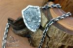 Стильный серебряный набор, включающий подвеску в форме щита с Георгием Победоносцем и мужскую якорную цепочку. Центральный элемент — рельефная подвеска с детализированным сюжетом победы над драконом. Фактура дерева, объемные заклепки и выразительная композиция создают эффект исторического артефакта и подчеркивают символику защиты и силы.