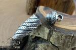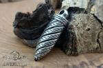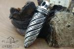 Корпус покрыт диагональными витками, напоминающими закрученные перья: каждая полоса имеет углублённый контур с чернением и центральную прожилку, создающую выразительный контраст полированных граней и затемнённых канавок. Орнамент равномерно повторяется по всей длине, формируя динамичный спиральный рисунок.