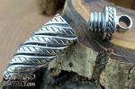 В верхней части — массивный винтовой узел: кольцевые проточки с чернением чередуются с гладкими кольцами, добавляя изделию объём. Ушко выполнено как часть крышки, и служит отверстием для размещения более крупного ушка для цепей разной толщины.