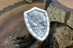 Стильная подвеска в форме щита с рельефным изображением Георгия Победоносца, поражающего дракона. Лицевая сторона выполнена с высокой детализацией: фактура дерева, объемные заклепки по контуру и выразительный сюжет создают эффект старинного геральдического артефакта. Изделие подчеркивает силу, защиту и мужской характер.